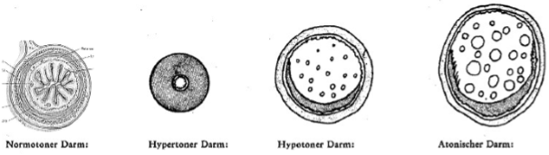 Ein entscheidendes Kriterium für einen gesunden Darm ist seine Fähigkeit, sich nach Mahlzeiten auch wieder leer machen zu können. Dazu braucht es einen guten Tonus der Darmmuskulatur (siehe Bild normotoner Darm), um die einzelnen Muskelschichten koordiniert einsetzen zu können. Jede akute Überforderung und Reizung provoziert eine Gegenreaktion: Den hypertonen, spastischen, schmerzenden Darm. Nach Wegfall des Reizes kann er sich wieder in den Normalzustand zurückbilden. Bei Fortbestand der Irritation kommt es zu einer chronischen Überforderung mit zunehmender Ermüdung, zu einem hypotonen Darm. In diesem schlaffen und erweiterten Muskelschlauch ist es feucht, dunkel, warm; der Transport stagniert, so dass optimale Bedingungen zur Fermentation oder Fäulnis von noch unverdauter Nahrung gegeben sind. Die entstehende Inhaltsvermehrung durch Gase wird dann als vergrößerter Bauch deutlich sichtbar. Ein Beweis dafür, dass die Verdauungskraft zuletzt nicht ausreichend war, um die Nahrung richtig zu verarbeiten.