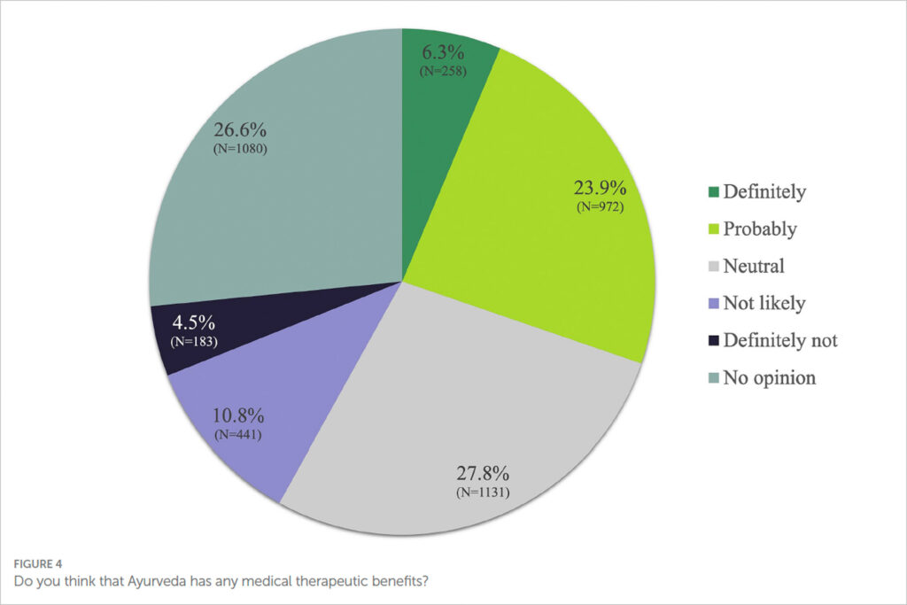 Während einige frühere repräsentative Studien in Deutschland auf eine hohe Nutzung von TCIM in Deutschland hinweisen, gibt es keine derartigen Daten zu Ayurveda. Trotz des zu erwartenden wachsenden Interesses an Ayurveda als medizinischem Ansatz gibt es nach wie vor einen bemerkenswerten Mangel an robusten, repräsentativen Umfragedaten über die Gesamtnutzung und die Wahrnehmung des Ayurveda durch die Nutzer in Deutschland.